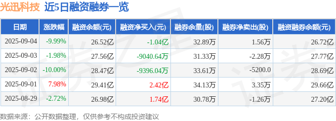 光迅科技融资融券信息显示,融资方面,当日融资买入6.43亿元,融资偿还7.47亿元,融资净偿还1.04亿元。融券方面,融券卖出2.62万股,融券偿还1.06万股,融券余量32.89万股,融券余额1937.55万元。融资融券余额26.72亿元。